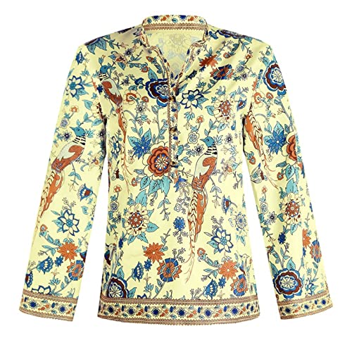 T-Shirt Top Camicetta Donna Scollo a V Lettere Stampa Pulsante Manica Lunga (XXL,3- Giallo)