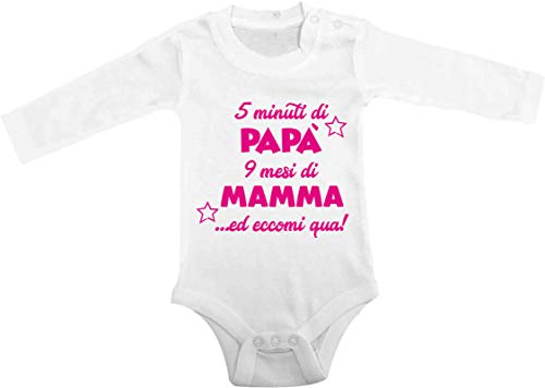 T-shirteria Body Neonato Divertente Manica Lunga Femminuccia 5 Minuti di Papà, 9 Mesi di Mamma ed eccomi Qua!Baby Body Simpatico