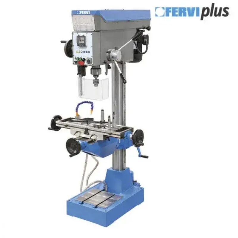 Il trapano fresa a colonna con discesa automatica Fervi T073DA è un utensile professionale ideale per eseguire lavori di fresatura e foratura.Questo trapano a colonna permette di effettuare foratura in ghisa preforata fino a 30 mm, acciaio preforato fino a 32 mm, fresatura con fresa ad inserti fino a 80 mm e fresatura fino a 25 mm.Inoltre è possibile effettuare lavori di maschiatura fino a 24 mm di capacità.Dotato di trasmissione a cinghia a velocità variabile, questo trapano a colonna reversibile è dotato di sistema di refrigerazione integrato per offrire la massima operatività.Il Fervi T073 presenta mandrino a cremagliera da 1 - 13 mm di capacità, stabile e resistente offre lavorazioni sempre precise e pulite.Inoltre il sistema a discesa automatica permette un avanzamento del trapano controllato al millimetro, per ottenere risultati ancora più precisi ed affidabili. Tipologia: Trapano fresa a colonna Alimentazione: Corrente Potenza: 1,1 - 1,9 kW Tensione: 400 V Motore: 400 V 50