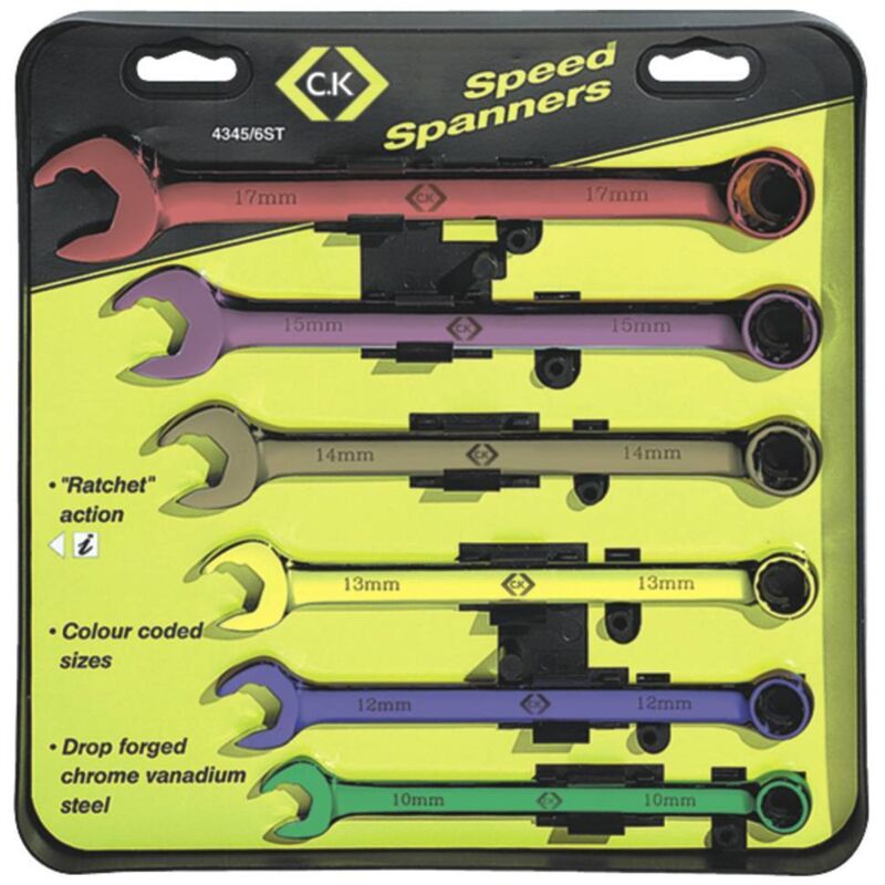 Dettagli tecnici Dimensione chiave (metrica) 10 mm, 11 mm, 12 mm, 13 mm, 14 mm, 15 mm, 16 mm, 17 mm Materiale Acciaio al cromo vanadio Proprietà del materiale temperato Tipo prodotto Kit chiavi combinate Chiavi combinate C.K set di 6 Acciaio al cromo vanadio forgiato temprato e rinvenuto per robustezza e durata. Codice cromatico per riconoscimento rapido della grandezza corretta. Innovativo meccanismo a cricchetto per utilizzo in spazi ristretti. Estremità poligonale con piegatura di 12° per facile accesso. Fornite in un pratico supporto a parete. Incluso nella consegna Chiave ad anello a forcella: SW 10/12/13/14/15/17 mm. Requisiti di sistema null