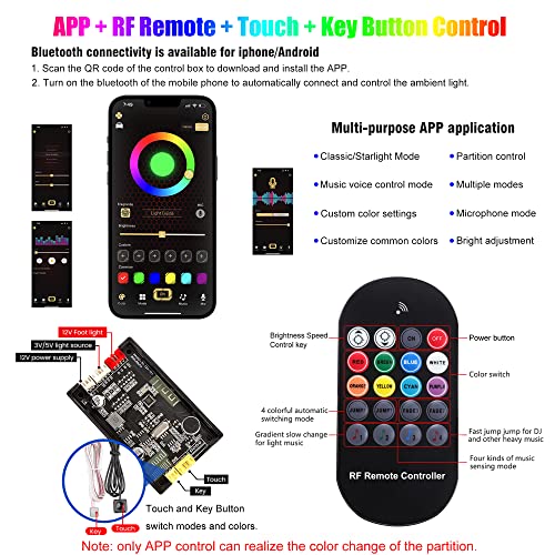 【App + RF Remote + Touch + Controllo del tasto】 Con 16,7 milioni di colori, imposta più scene tramite l'app "CARDI Tech". Più funzioni come Footwell Classic/Starlight Modalità, regolazione della luminosità, impostazioni di colore personalizzato, personalizza i colori comuni, modalità microfono, modalità di controllo vocale della musica, contro