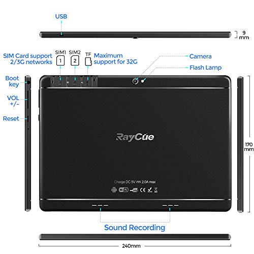 Tablet Android da 10.1 pollici 3G, CPU Quad Core Android 8.1, 32GB ROM 2GB RAM, IPS HD 1280x800 Telefono sbloccato Phablet PC con doppio slot per schede SIM (Nero)
