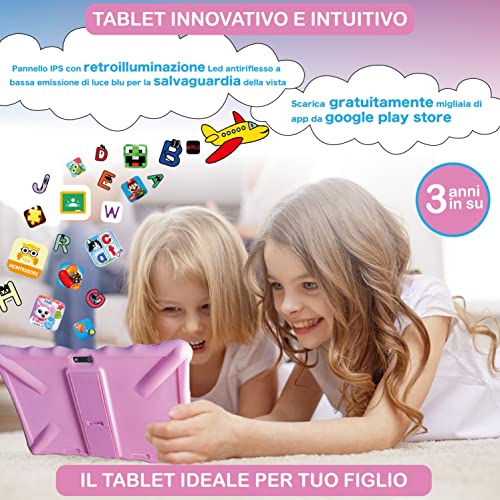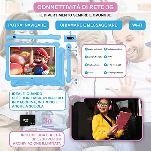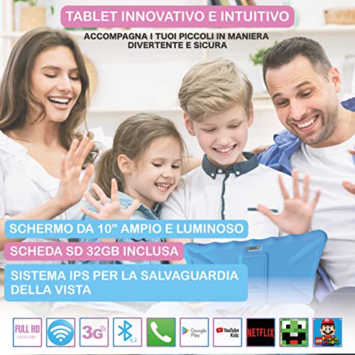 Tablet per Bambini 10" 3-12 Anni, Android, Quad Core, Fotocamera 2MP + 5MP, 2GB ROM 32GB, Wifi, 3G Dual Sim, Gps, 5000 Mah, Lcd, schermo IPS anti luce blu, Parental Control, Notebook, regalo