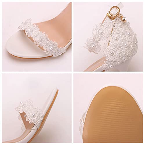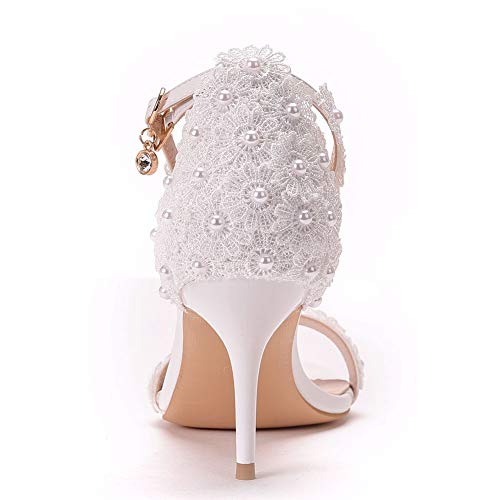 Con Tacco a Spillo da Donna Scarpe da Sposa Sandali Estivi Bianco Pizzo Raso Imitazione di Perle Pompe 7 cm Bocca Poco Profonda Cena Party Cocktail Party Matrimonio Sposa,Bianca,38 EU