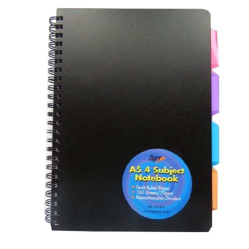 Taccuino in formato A5 con rilegatura a spirale, copertina in PVC e separatori di materie, colore nero