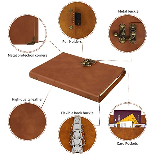 【Taccuino in Pelle A5】La superficie del taccuino da viaggio retro business è realizzata in morbida pelle PU per una sensazione confortevole, durevole, e la chiusura in metallo garantisce la sicurezza del diario. Allo stesso tempo, abbiamo aggiunto angoli protettivi in metallo ai quattro angoli per proteggere il taccuino e conferirgli un fascino vintage. Per l'uso quotidiano o per i viaggi all'aperto.