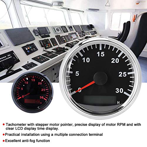 Tachimetro, 85 mm/3,3 pollici Sensore contagiri per barche IP67 Tachimetro impermeabile 12V/24V Luce rossa con display LCD Contaore di servizio 3000 RPM (Quadrante nero con cornice argentata)