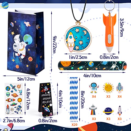 Bomboniere per Bambini: Riceverai 96 pezzi di bomboniere per feste spazio, tra cui 12 braccialetti schiaffo, 12 segnalibri magnetici, 12 sacchetti per feste, 12 collane, 12 portachiavi, 12 tatuaggi temporanei, 20 cannucce di carta. I nostri giocattoli spazio sono realizzati con materiali ecocompatibili, resistenti e riutilizzabili.