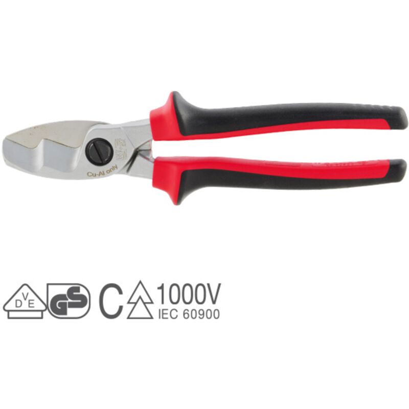 Per cavi flessibili in rame e alluminio Cerniera regolabile con vite e controdado Per cavi ø 22mm (= 80 mm²) Sezione massima del cavo: 50 Lunghezza totale: 200 Esecuzione/azionamento: meccanico a una mano Isolamento di protezione 1000 V Testato dal VDE Adatto per conduttore a filo sottile Adatto per conduttore multifilare Materiale dell'impugnatura: bicomponente
