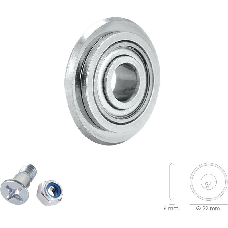 Tagliapiastrelle di ricambio Rodel - Valido per tagliapiastrelle professionale Wolfpack 800 mm. e 1200 mm. - Misura: diametro esterno: Ø 22 mm. - Diametro albero: 6 mm. - Larghezza: 6 mm.