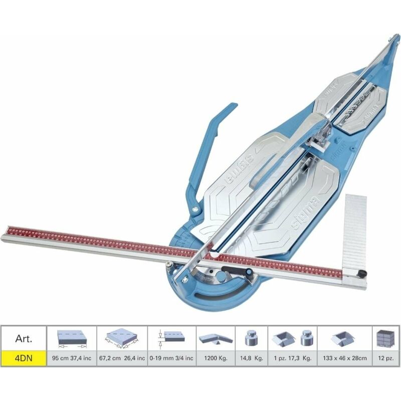 TAGLIAPIASTRELLE SIGMA 4DN CM 95 INCISIONE A SPINTA SERIE 4 NEX Incisione a spinta, facile e profonda con il minimo sforzo, perfetta per piastrelle ruvide, spessorate e di grandi dimensioni. Impugnatura di forma ergonomica, specifica per incisione a spinta. La rotella d'incisione diametro 16 mm è sempre ben visibile lato operatore e dotata di doppio molleggio per l'incisione ammortizzata di piastrelle strutturate. La rotella d'incisione ruota su cuscinetto a rulli, guidata lateralmente da un guscio in metallo antifrizione inserito in un'alloggiamento fresato CNC, per evitare attriti ed usura laterale. Rotelline diametro 16 mm con cuscinetto interno per la massima scorrevolezza in fase d'incisione, disponibili anche nella versione rivestita TIN. Piede di spacco largo 120 mm con protezione anti segno intercambiabile. Il carrello di scorrimento è privo di usura, grazie a 3 cuscinetti a doppia corona di sfere che garantiscono precisione nel tempo, senza necessità di manutenzione. E'
