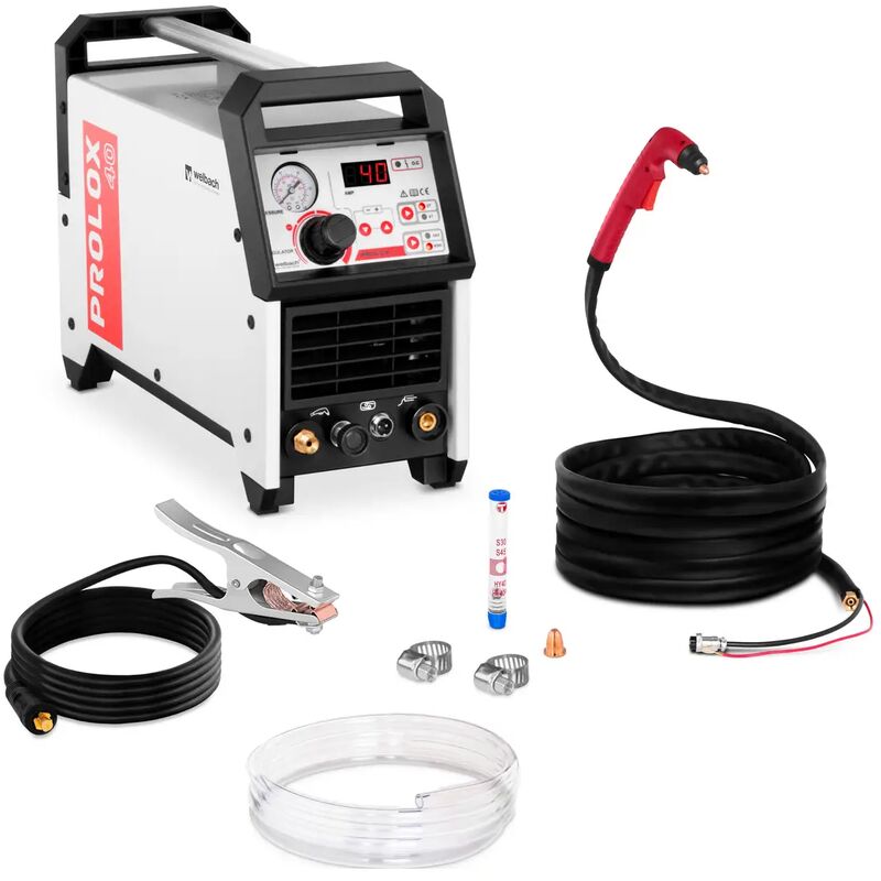 Tagliatrice al plasma Prolox 40 di Welbach La tagliatrice al plasma Prolox 40 combina la precisione del digitale con componenti di alta qualità che assicurano risultati ottimali nel taglio di metalli. Con i suoi valori prestazionali eccellenti, il dispositivo è fondamentale in officine, nell'edilizia e anche nell'ambito privato, dove devono essere lavorati metalli conduttori come rame, acciaio, ottone, acciaio inox o alluminio. Il pannello di controllo dispone di una manopola classica per l'aria compressa e di un menu di navigazione digitale. Dettagli tecnici Tensione / Frequenza 230 V / 50 Hz Corrente nominale in entrata 28,6 A Corrente in ingresso max. 38,7 A Potenza nominale in entrata 4,3 KVA Max. potenza ingresso 8,9 KVA Tensione a vuoto 230 VCorrente di taglio 15 - 40 A Durata del funzionamento/ Duty Cycle 60 % Corrente di taglio con Duty Cycle 60 % 40 A Corrente di taglio con Duty Cycle 100 % 31 A Accensione Accensione pilota Max. potenza di taglio 12 mm Potenza taglio di alta