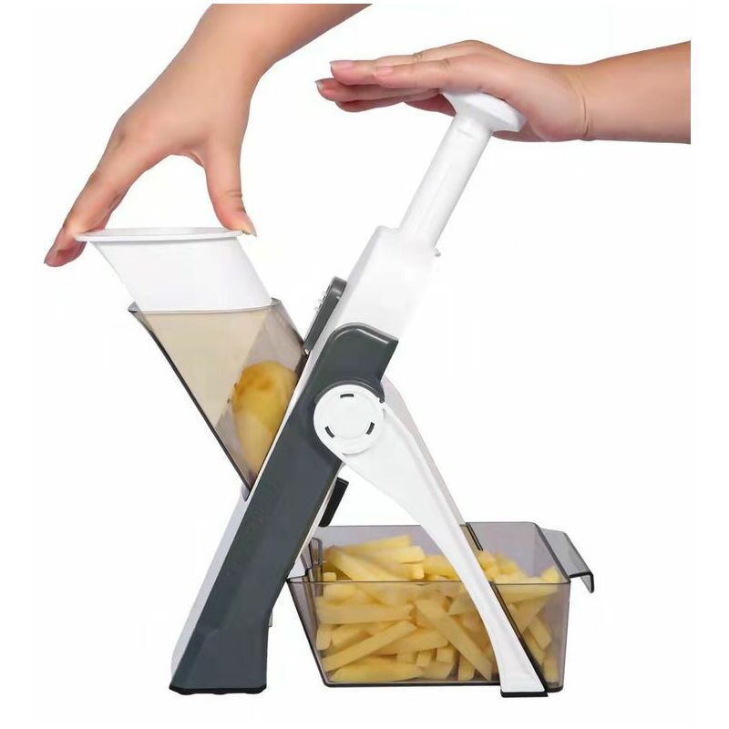 Descrivi DUREVOLE: Il corpo dell'affettatrice è realizzato in plastica ABS atossica e la lama è realizzata in acciaio inossidabile affilato e robusto, offrendo tagli duraturi che non arrugginiscono o LEGGERO E COMPATTO: l'affettatrice per verdure ti offre un'esperienza di affettatura senza disordine, leggera e portatile, rendendola il compagno perfetto per picnic, barbecue e cucina. Può anche essere piegato per riporlo al sicuro. Affettatrice multifunzionale: un'affettatrice multifunzionale in cui puoi realizzare fette, patatine fritte e dadi di dimensioni uniformi. Un utensile da cucina completo per diversi tipi di fette come cubetti, dritti, stecchi e julienne. Ideale per affettare mele, barbabietole, carote, prosciutto, zucchine, patate e altro ancora. FACILE DA USARE: questo versatile tagliaverdure è facile da usare, non c'è bisogno di cambiare la lama ogni volta che tagli, basta ruotare la manopola per regolare lo spessore della fetta direttamente impilata nel contenitore di