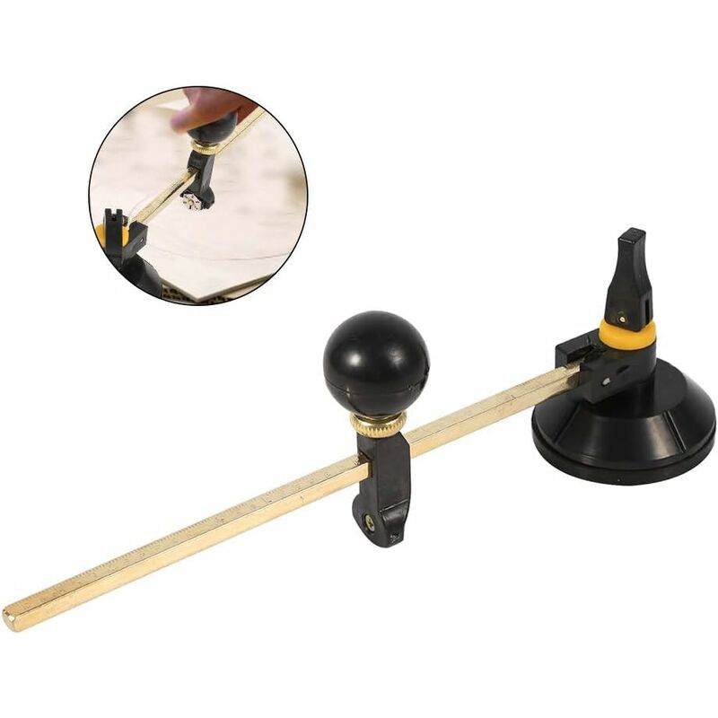 Questo tagliavetro professionale è realizzato in gomma e alluminio di alta qualità con rame placcato, ecologico, durevole e robusto da usare. Tagliavetro circolare regolabile, pulsante tondo, ventosa che tiene il centro mentre il quadrante taglia. La leva ha scale chiare che ne facilitano la lettura. Stile bussola e Max. Cerchio Dia. di taglio è di 40 cm. Questo utensile da taglio è perfetto per hobbisti e tagliatori di vetro professionisti. Specifica: Condizione: 100% nuovo di zecca Colore: mostrato come immagine Materiale: gomma e alluminio Lunghezza totale: ca. 30 cm / 11,8 pollici Diametro ventosa: ca. 5,5 cm / 2,2 pollici Lunghezza leva: ca. 20 cm / 7,9 "" Max. Diametro del cerchio: ca. 40 cm / 15,7 "" Peso del pacchetto: ca. 130 g