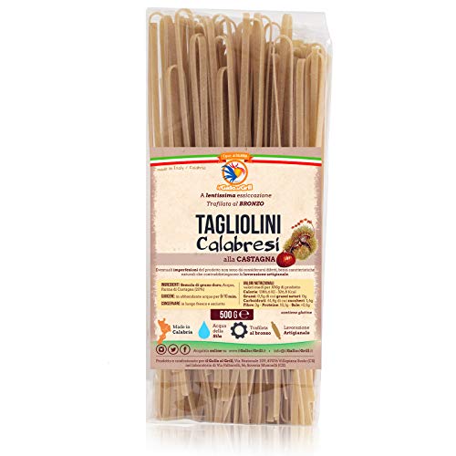 Tagliolini Calabresi alla Castagna Silana in confezione da 500g. Pasta artigianale Calabrese a lentissima essiccazione con trafila al bronzo, realizzata con semola di grano duro Italiana di grani mondiali selezionati di altissima qualità, acqua purissima della Sila e farina di castagne Silane.