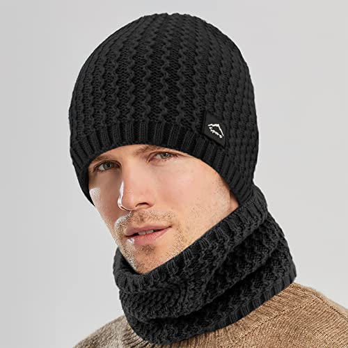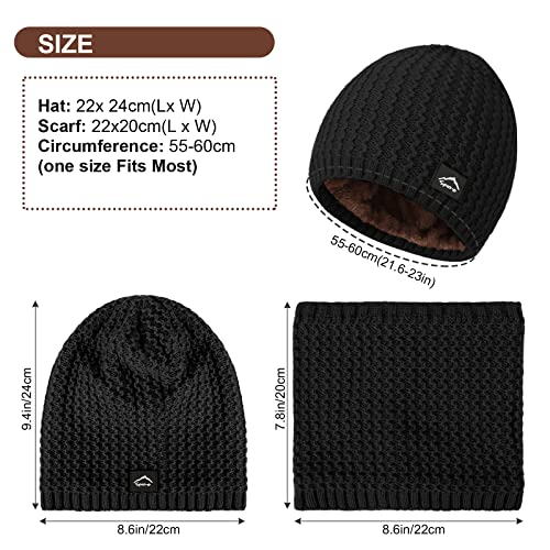 TAGVO 2 PCS Cappello Invernale Beanie Sciarpa Set per Unisex, Doppio Strato Termico in pile linea Inverno, per l'aria aperta, Passeggiate, Shopping, Sci, Pesca, Campeggio Nero