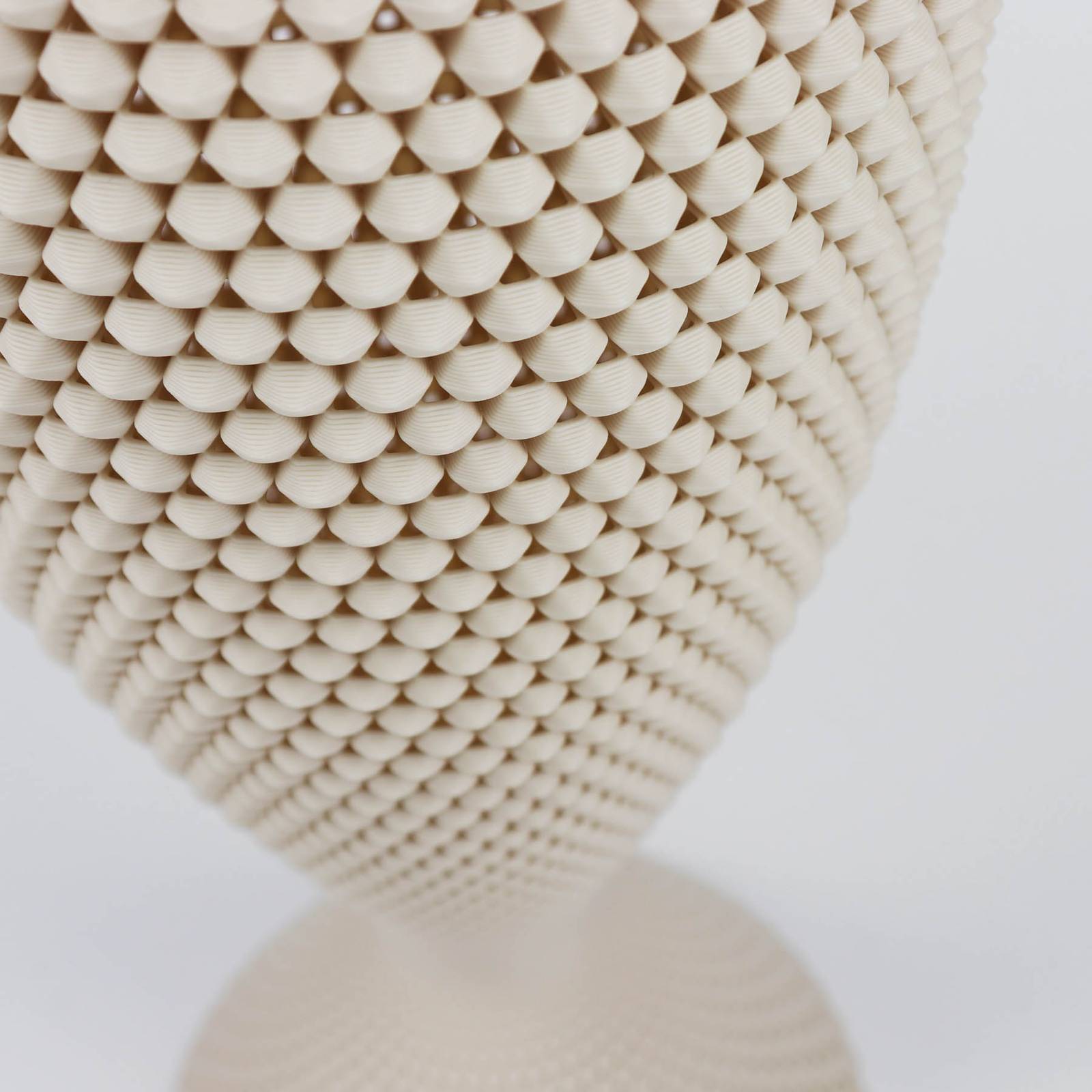 Lampada da tavolo Beige Diamond dalla stampante 3D - con un bel modello di uscita Il corpo snello della lampada da tavolo Diamant è paralume e supporto in uno ed è realizzato con uno speciale materiale riciclato composto da scarti della lavorazione del legno e della produzione di carta e amido di mais. La lampada da tavolo viene poi "stampata" con una stampante 3D. Questo processo di produzione sostenibile non produce rifiuti, non ci sono emissioni e il produttore Tagwerk utilizza elettricità verde per la produzione. Tagwerk è un'azienda che sta usando per la prima volta la stampa 3D per la produzione in serie di beni di consumo quotidiano. Il biomateriale di lignina utilizzato per la lampada da tavolo Diamant è privo di petrolio e di sostanze tossiche ed è altrettanto robusto e utilizzabile dei materiali convenzionali. Prodotto in Germania