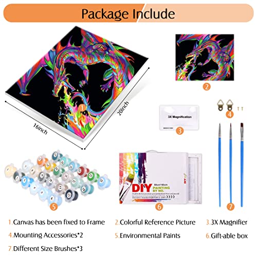 ◎CARATTERISTICHE DEL PRODOTTO-Dipingi con i numeri per principianti adulti, pittura fai-da-te incorniciata da 16 x 20 pollici, motivo di pittura a olio Drago colorato. Questa tela è una tela testurizzata prestampata che ha piccole aree di pittura che possono calmare e concentrare la tua attenzione.