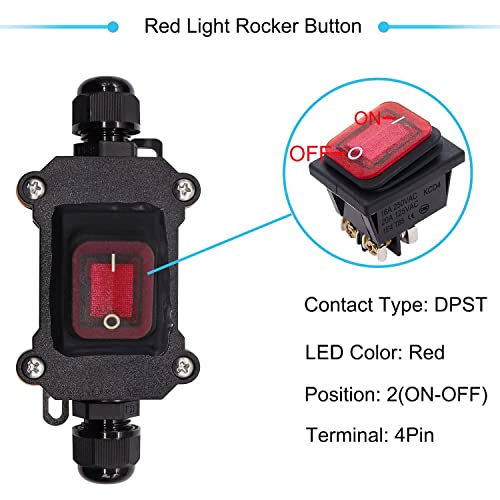 Taiss Interruttore in linea scatola di giunzione 220V interruttore scatola di derivazione a 2 vie IP68 Impermeabile DPST 4Pin On Off Interruttore a Bilanciere 2 Posizione con Luce Rossa K062-220V-LS