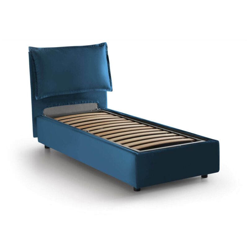 LETTO SINGOLO ZUSANNE - Letto contenitore con rivestimento in tessuto, 100% Made in Italy, Apertura frontale, adatto per materasso Cm 90x190, Blu. STRUTTURA - La struttura del letto è in fibra di legno rialzata da terra con piedini in ABS ed è rivestita in morbido tessuto di poliestere sfoderabile e lavabile in lavatrice a 30° - La testiera lineare abbinata in tessuto con cuciture a vista, è solida e resistente - La rete a doghe in legno multistrato è inclusa nella struttura - Meccanismo di apertura in ferro - L'aggiunta del pratico box contenitore salvaspazio permette al letto di trasformarsi in uno spazioso cassone per lenzuola, cuscini e piumoni. MONTAGGIO - Il montaggio è semplice e veloce: grazie agli strumenti di montaggio forniti in un kit insieme al prodotto e al libretto delle istruzioni potrete montare il vostro prodotto in pochi minuti. 100% MADE IN ITALY - La produzione 100% italiana garantisce affidabilità e resistenza - L'accortezza ai processi produttivi, la scelta di