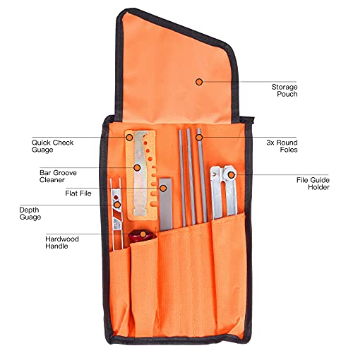 [Contenuto della confezione]: 3 lime rotonde 7/32 (5,5 mm), 3/16 (4,8 mm), 5/32 (4 mm) -6 pollici calibro di profondità catena lima piatta indicatore di prova rapida scanalatura asta manico in legno pulito e borsa ( arancione) -guida allo stoccaggio (accessorio).