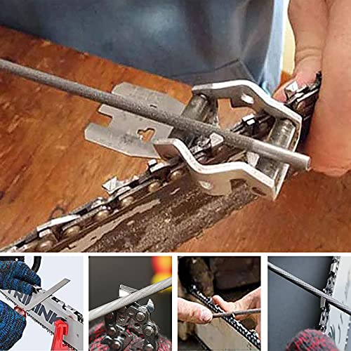 [Design pesante] Kit di lima per la manutenzione di catene, lame e catene a rulli. Le lime piatte a denti fini di alta qualità e le lime rotonde sono progettate per limare e tagliare rapidamente. I segni e le dimensioni dell'angolo dei denti sono incisi sulla guida della lima e sul calibro per l'allineamento durante l'uso.