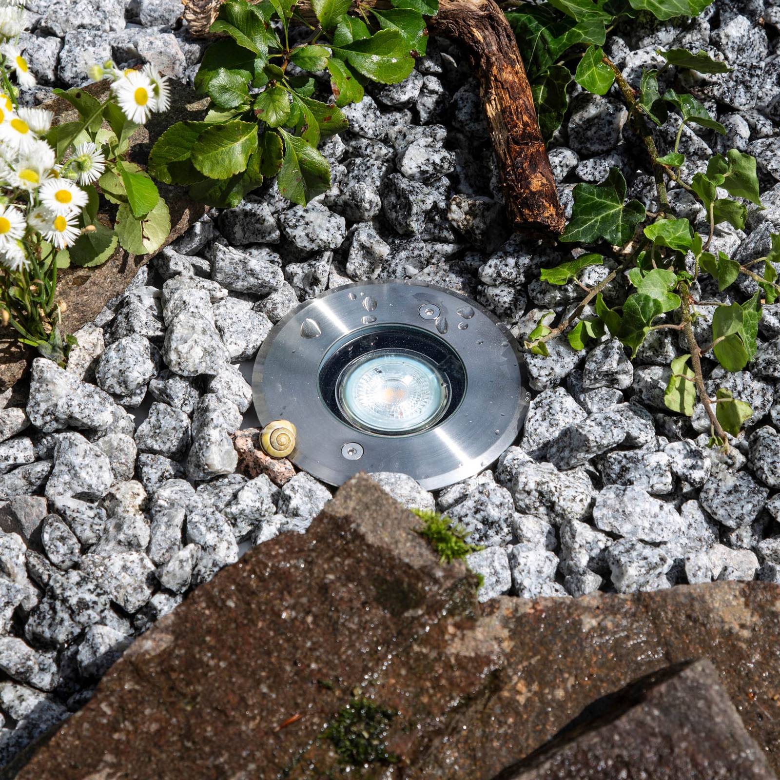 Apparecchio da incasso a terra Talpa in forma rotonda in acciaio inossidabile e alluminio Grazie alla sua resistenza alle intemperie (IP67) e alla capacità di carico fino a 3.500 kg, l'apparecchio da incasso a terra Talpa è l'opzione ideale per illuminare i sentieri delle proprietà e i viali dei garage. Si può percorrere con una velocità massima di 20 km/h. L'alloggiamento è in alluminio, il coperchio in acciaio inossidabile V2A. L'alimentazione dei cavi passa attraverso il collegamento a vite nella base dell'apparecchio. Il cavo può avere un diametro fino a 9 mm. Un vetro di protezione trasparente e uno opaco sono inclusi nella fornitura. Viene fornito anche un vaso da incasso in plastica opzionale. Se si usa questo, il diametro di montaggio si riduce a 9,6 cm, la profondità di montaggio rimane invariata. - Diametro di montaggio in caso di montaggio con vaso di montaggio: 10,2 cm - Gamma di rotazione: 15 - Collegamento diretto a 230 V