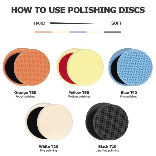 【Compressione, lucidatura e ceratura】Sono disponibili 5 diversi tamponi in spugna premium per far risplendere la vostra auto! Tampone arancione per rimuovere gli strati di ossidazione e i graffi moderati e leggeri. Tampone di lucidatura giallo e blu per la rimozione dei danni causati dal sole e delle mascherine. Pad bianco e nero per la finitura e la ceratura.