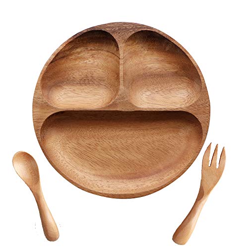 TAMUME Piatto in Legno con 3 Scomparti per Bambini - Vassoio per Alimenti, Set Cucchiaio e Forchetta in Legno, Marrone Scuro Piatti da Portata, Rotondo