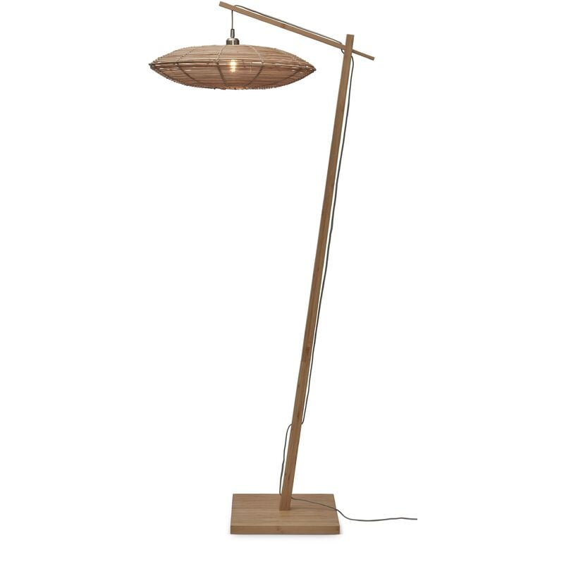 Piantana in bamboo con paralume in rattan misure corpo: altezza 176 cm larghezza 77 cm misure paralume: 55x14 cm misure base: 36x36x3 cm cavo rivestito in tessuto grigio lungo 200 cm con interruttore