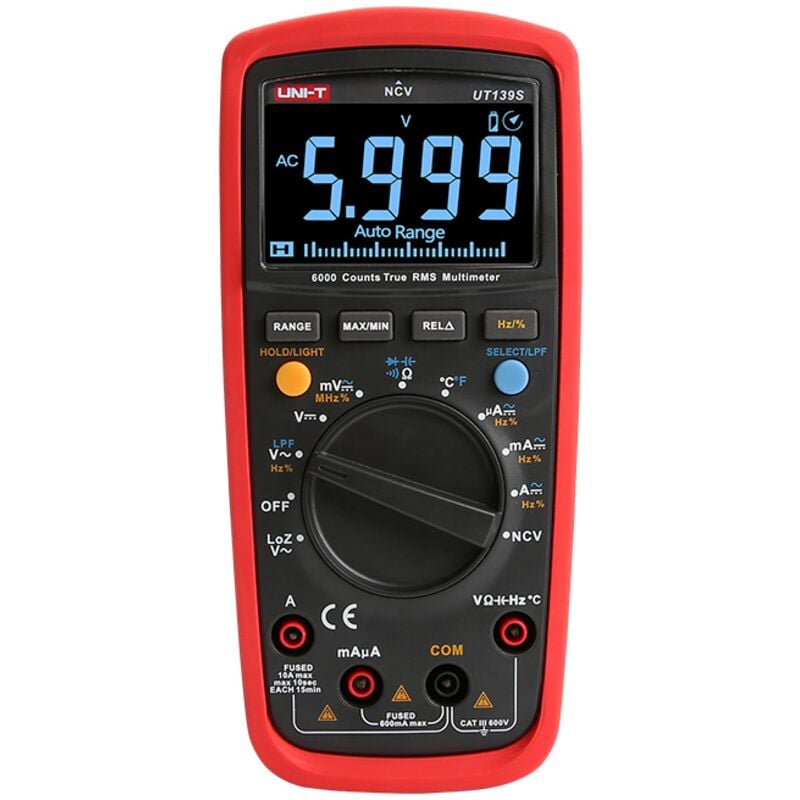 La serie UT139 sono multimetri digitali CAT III 600V progettati per elettricisti. La sua funzione NCV può controllare efficacemente lo stato elettrico misurando l'intensità del campo EM. Portata Volt DC: ±(0.5%+2) 600V Volt AC: ±(1%+3) 600V Ampere DC: ± (0.7%+2) 10A Ampere AC: ±(1%+3) 10A Ohm: ±(1%+2) 20MΩ Display 58 x 36 mm, 2000 counts Alimentazione 2 batterie AA Peso 354 grammi Dimensioni 17 x 80 x 48 mm Accessori inclusi Coppia di puntali, batterie Produttore UNI-T Modello UT-139A Codice prodotto 40.001.0011013