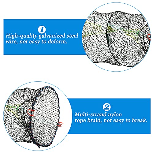 【Ampiamente Usato】Le gabbie per granchi rotonde ispessite possono essere utilizzate in acqua dolce e salata, con una lunga durata, adatte per la pesca di tutti i tipi di granchi, gamberi, aragoste, anguille e altri pesci di piccole e medie dimensioni. Facile da usare e da trasportare, è uno strumento ideale per catturare granchi o gamberetti all'aperto.