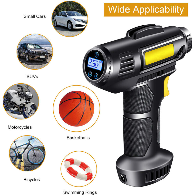 Mesurer la pression. Sans fil et portable, compact et beau. Avec la fonction d'éclairage de secours, il peut également être utilisé la nuit. Il peut être gonflé et illuminé. Opération simple, démarrage à une touche. Résistance à haute température, qualité antigel, antidéflagrante et fiable. La batterie a une grande capacité et peut être rechargée à plusieurs reprises. Caractéristiques: [Éclairage d'urgence]Ce produit a une fonction d'éclairage et peut être utilisé pour les urgences la nuit. Ne paniquez pas lors du gonflage la nuit ou dans des situations particulières. [Arrêt automatique] Vous pouvez prérégler la pression des pneus et le gonfleur arrêtera automatiquement le gonflage après avoir atteint la pression des pneus spécifiée. Vous n'avez pas besoin de rester à côté et d'attendre qu'il soit complètement chargé. [Mesure précise de la pression]Connectez la valve du pneu et appuyez sur la touche R pour afficher la valeur actuelle de la pression des pneus avec précision et