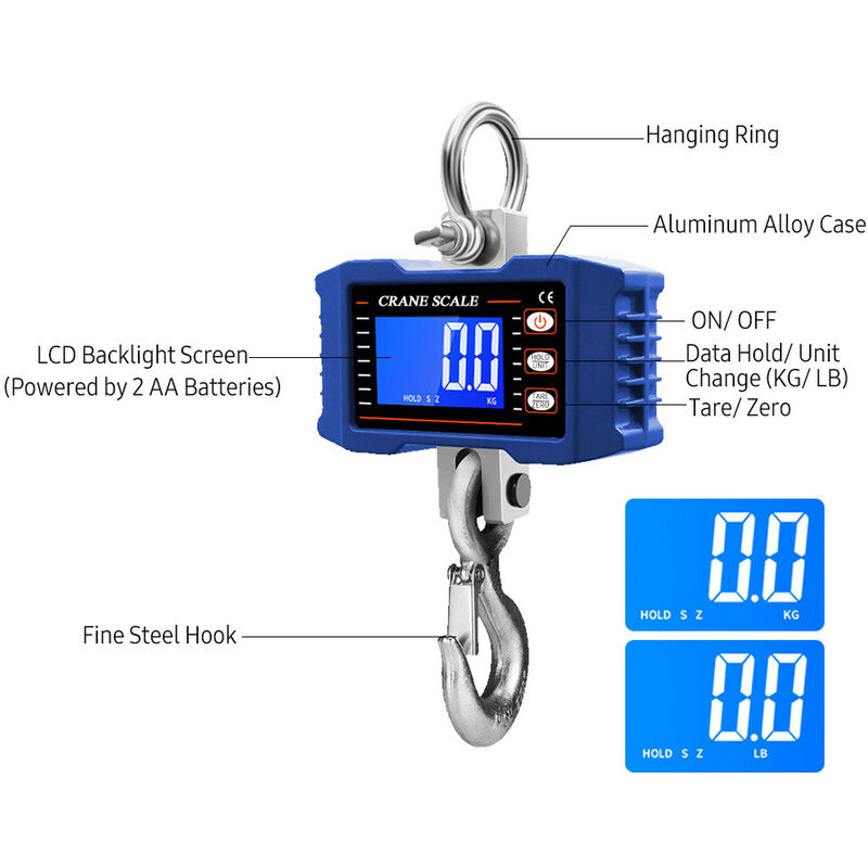 Cette balance suspendue numérique est portable mais elle peut supporter jusqu'à 1000 kg au-delà de votre imagination. Avec un écran LCD clair et une unité variable (kg/lb), il est facile à lire et peut répondre à divers besoins. Il est également équipé d'une télécommande pour une utilisation plus pratique. Dans l'ensemble, cette balance à grue multifonctionnelle est applicable à l'industrie alimentaire/sidérurgique, aux chantiers de construction, aux travaux extérieurs et plus encore. Remarque: Taille et la couleur peut être légèrement différente en raison de la mesure manuelle et des différentes conditions d'éclairage, veuillez prévaloir en nature. Merci. Spécifications: Couleur: Orange/Bleu/Noir (en option) Matériau: acier + alliage d'aluminium Min. Capacité: 10 kg (22 lb) Max. Capacité: 1 000 kg (2 204 lb) Résolution: 0,5 kg Commutateur d'unité: kg/lb Alimentation de la balance à grue: 2 piles AA< br /> Alimentation de la télécommande: pile alcaline 23 A 12 V intégrée >