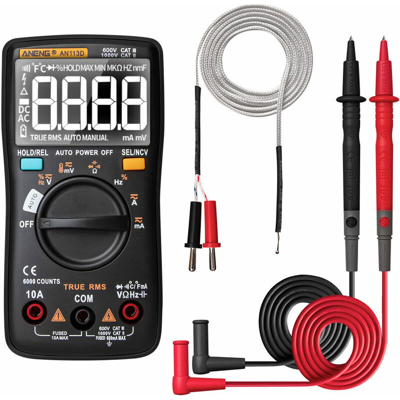 Questo prodotto è un multimetro digitale multifunzionale a portata automatica con 6000 conteggi e display LCD. Le funzioni di misurazione includono tensione CC/CA, corrente CA/CC, resistenza, test diodi/continuità, NCV, frequenza/ciclo di lavoro, capacità, temperatura. Supporta vero valore efficace, spegnimento automatico e mantenimento dei dati. Caratteristiche: Multimetro multifunzionale con display LCD retroilluminato, può essere utilizzato per misurare la tensione CC/CA, la corrente CA/CC, la resistenza, il test dei diodi/ continuità, NCV, frequenza/ciclo di lavoro, capacità, temperatura. Sensore integrato, supporta il rilevamento senza contatto, quando viene rilevata una tensione CA nelle vicinanze, il valore sullo schermo lampeggia e viene emesso un segnale acustico di allarme. Supporta manuale e amp;