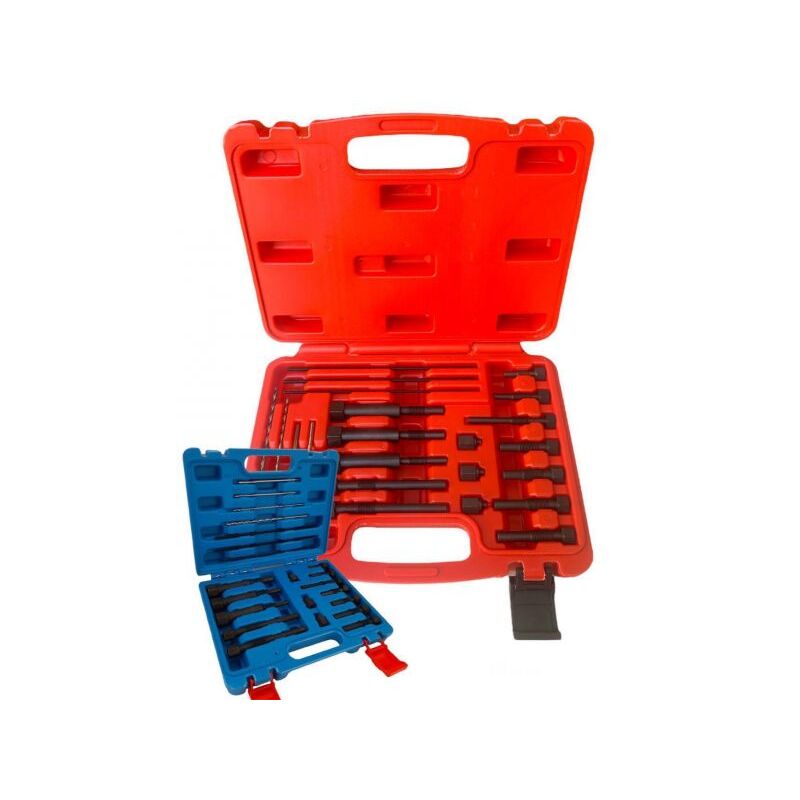Kit 22PZ utensili rimozione elettrodo estrattore riparazione candelette M8 M10 Il kit consente la rimozione di un filamento rotto di candelette con filettature M8x1.0, M10x1.0 e M10x1.25. Specifiche: 2 attrezzi per filettare M4x0,7, lunghezza 180 mm 1 attrezzo per filettare M3x0,5, lunghezza 180 mm Punta da trapano HSS 2,5 x 120 mm e HSS 3,3 mm x 140 mm Rubinetto M3x0,5, lunghezza 100 mm Rubinetto M4x0,7, lunghezza 100 mm Cavo per filettature candele M8x1,0 - M10x1,0 - M10x1,25.