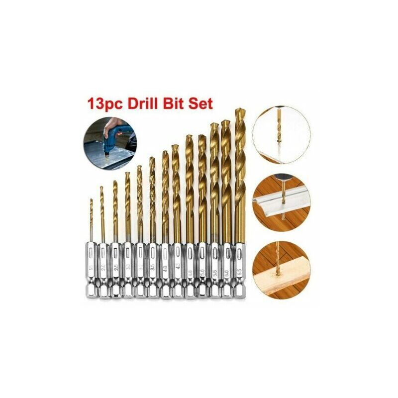 SET DI 13 PUNTE PER TRAPANO ED AVVITATORE PER FORARE FERRO E METALLI IN GENERE. REALIZZATE IN ACCIAIO HSS CON RIVESTIMENTO AL TITANIO. DOTATE DI ATTACCO ESAGONALE DA 1/4, ADATTE AD ESSERE MONTATE ANCHE SU AVVITATORI PER INSERTI GIRAVITE, SPROVVISTI DEL TRADIZIONALE MANDRINO DEI TRAPANI. CARATTERISTICHE: Materiale: titanio HSS rivestito con nitruro di titanio. Dimensione della punta: 1,5 mm, 2 mm, 2,5 mm, 3 mm, 3,2 mm, 3,5 mm, 4 mm, 4,5 mm, 4,8 mm, 5 mm, 5,5 mm, 6 mm, 6,5 mm. Rivestimento in nitruro di titanio facilita più penetrazione con meno sforzo. Gambo: 1/4 esagonale. Prodotto di qualità....