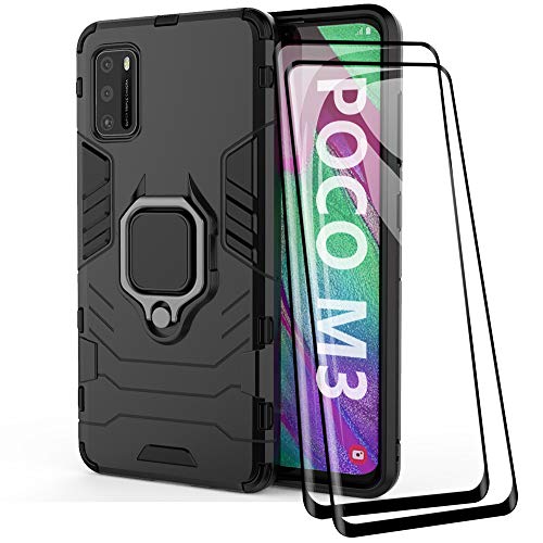 TANYO Cover + [2 Pezzi] Vetro Temperato per Xiaomi Poco M3, TPU/PC Dual Layer Armor Antiurto Protezione Custodia [360° Supporto] con Durezza 9H Pellicola Protettiva, Nero
