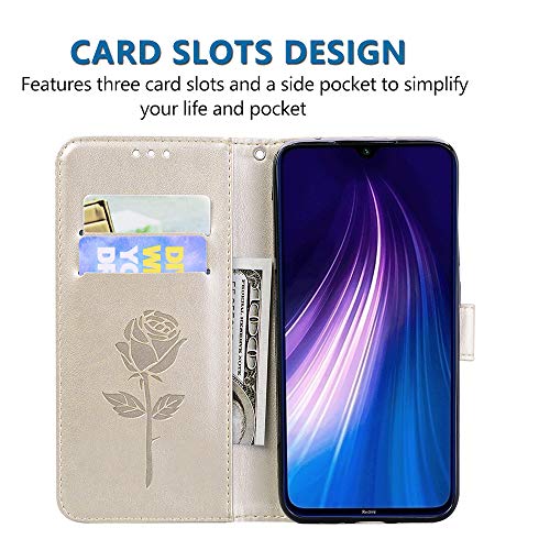 TANYO Custodia Adatto per Xiaomi Redmi Note 8T, Retro Flowers Design Pattern Custodia, PU Pelle Cover, [Carta Fessura] [Supporto Stand] Flip Wallet Case Cover. Oro