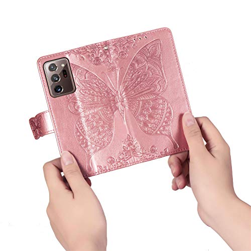TANYO Farfalla Custodia Folio per Samsung Galaxy Note 20 Ultra (5G / 4G), Cover in PU/TPU Pelle Flip Portafoglio con Contanti e Schede Slot, Note20 Ultra Telefono Case Custodie - Oro Rosa