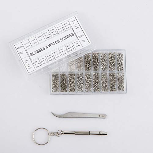 Set di 1000 viti assortite e 6 cacciaviti di diverse dimensioni, una pinzetta, un micro cacciavite multifunzione, 1 paio di ganci in silicone e un panno per occhiali.