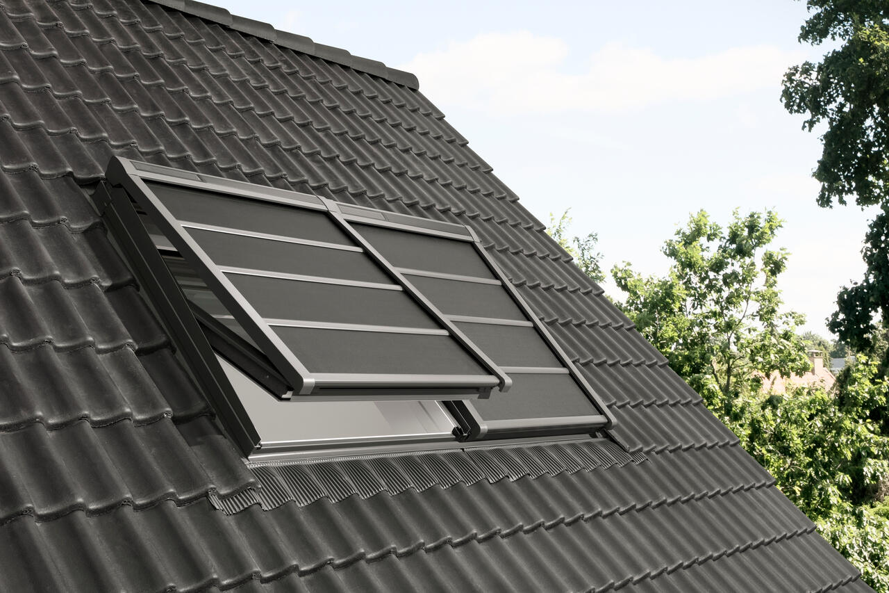 Tenda esterna oscurante per finestre per tetti VELUX. Realizzata con un tessuto oscurante,.resistente alle intemperie, e barre stabilizzanti in allumino. Il tessuto in poliestere è rivestito con.una pellicola in PVC testato per durare a lungo nel tempo. Combatte in modo efficare il calore.estivo. Comando a distanza incluso. Grazie all'alimentazione solare non richiede collegamenti alla rete elettrica. Si inserisce in modo armonioso nella linea del tetto.. Vuoi dormire sonni tranquilli hanno in una giornata di pieno sole e al fresco, scegli questa tenda. Buon livello di oscuramento ed effetto parasole. Non necessita di opere murarie