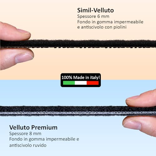 MATERIALI: Tappetini compatibili realizzati con Moquette di ottima qualità (Simil-Velluto Agugliato) Spessore 6mm oppure (Velluto Premium) Spessore 8mm . Resistente nel tempo, ignifuga, facile da lavare (lavabile anche con detersivo commerciale), inodore (non emana alcun tipo di profumo), impermeabile (nei periodi invernali il fondo in gomma impedisce all'acqua di penetrare ed arrivare al pianale interno dell'auto), morbida al tatto ma resistente agli strappi, non teme lo sfregamento di anfibi, scarponi da lavoro o tacchi a spillo