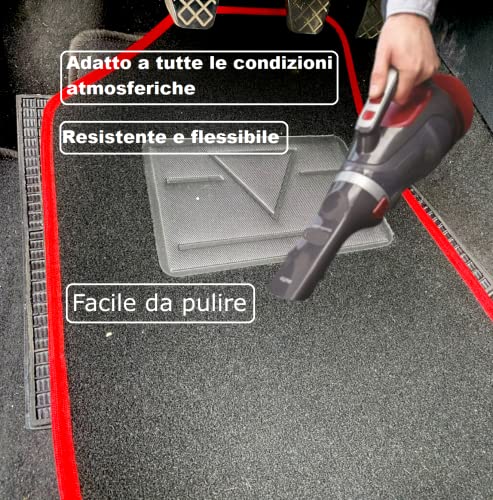 【Composizione】Kit 4 Tappetini Universali In Moquette con Battitacco lato guida e Bordo Rosso. Adatto particolarmente per City Car di Piccole e Medie dimensioni. Lavorati a mano e made in Italy.