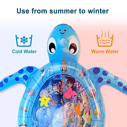 Facile da usare e imballare - Imposta il tappetino per l'acqua per bambini semplicemente gonfiando l'anello esterno e riempi la parte interna con acqua fredda o calda! Sei animali marini di schiuma si muoveranno nell'acqua mentre incoraggiano il bambino a sollevarsi sulle sue braccia per catturarlo. Dopo averlo usato, puoi semplicemente svuotare il tappetino, piegarlo o arrotolarlo e metterlo in pannoli