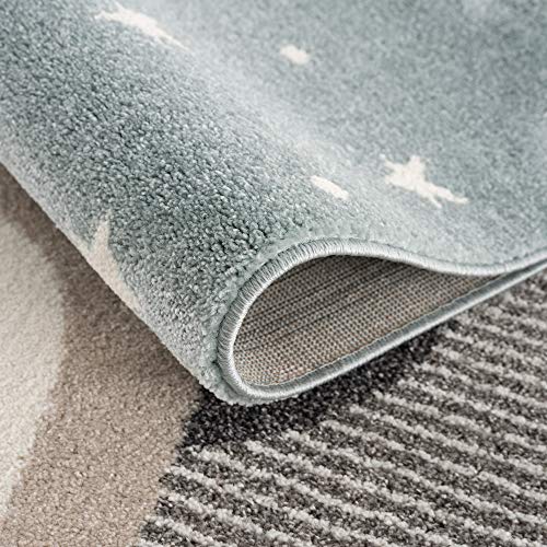 Tappeto per la cameretta dei bambini con fantasie come montagne, orsi, conigli, panda e stelle - colore: turchese e beige - 120 x 170 cm