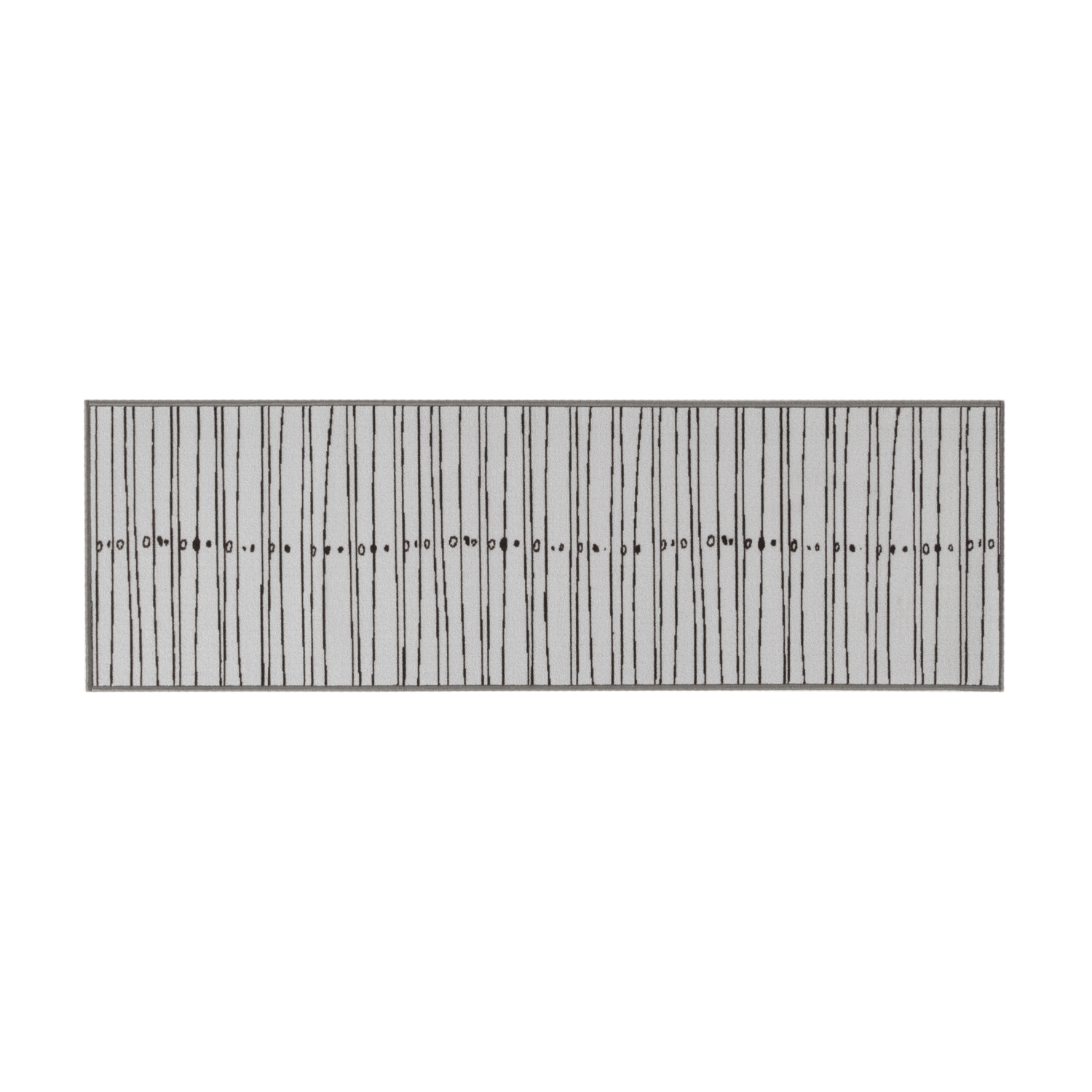 Tappeto per cucina con decoro a linee dal gusto orientale. Fine trama nel colore neutro a tinte bianco, nero e grigio donano eleganza all'ambiente. Il fondo garantisce la massima stabilità e aderenza antiscivolo.