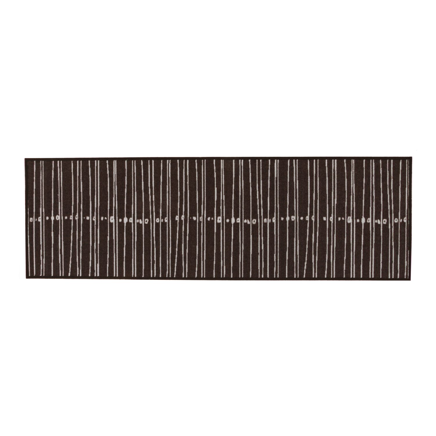 Tappeto per cucina con decoro a linee dal gusto orientale. Fine trama nel colore neutro a tinte bianco, nero e grigio donano eleganza all'ambiente. Il fondo garantisce la massima stabilità e aderenza antiscivolo.