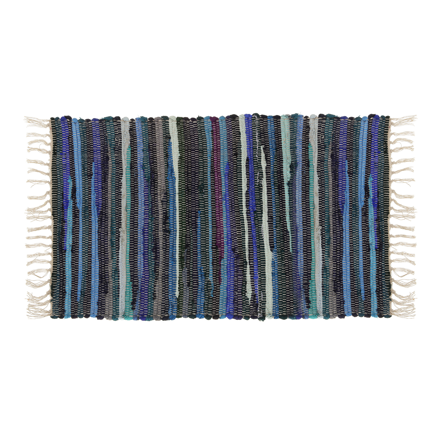 Varie tonalità di blu si legano e si alternano ad altri colori in un armonioso e studiato disordine. Questo tappeto dalla fantasia originale è l'ideale per rendere la tua cucina più vivace. Alle estremità presenta delle soffici frange bianche. Dimensioni: 50x80 cm. L'articolo è un pezzo unico, prodotto di una lavorazione con telaio a mano e composto da materiale tessile riciclato, assemblato artigianalmente. Potrebbe quindi variare per composizione e colorazione rispetto a quello presentato nell'immagine.