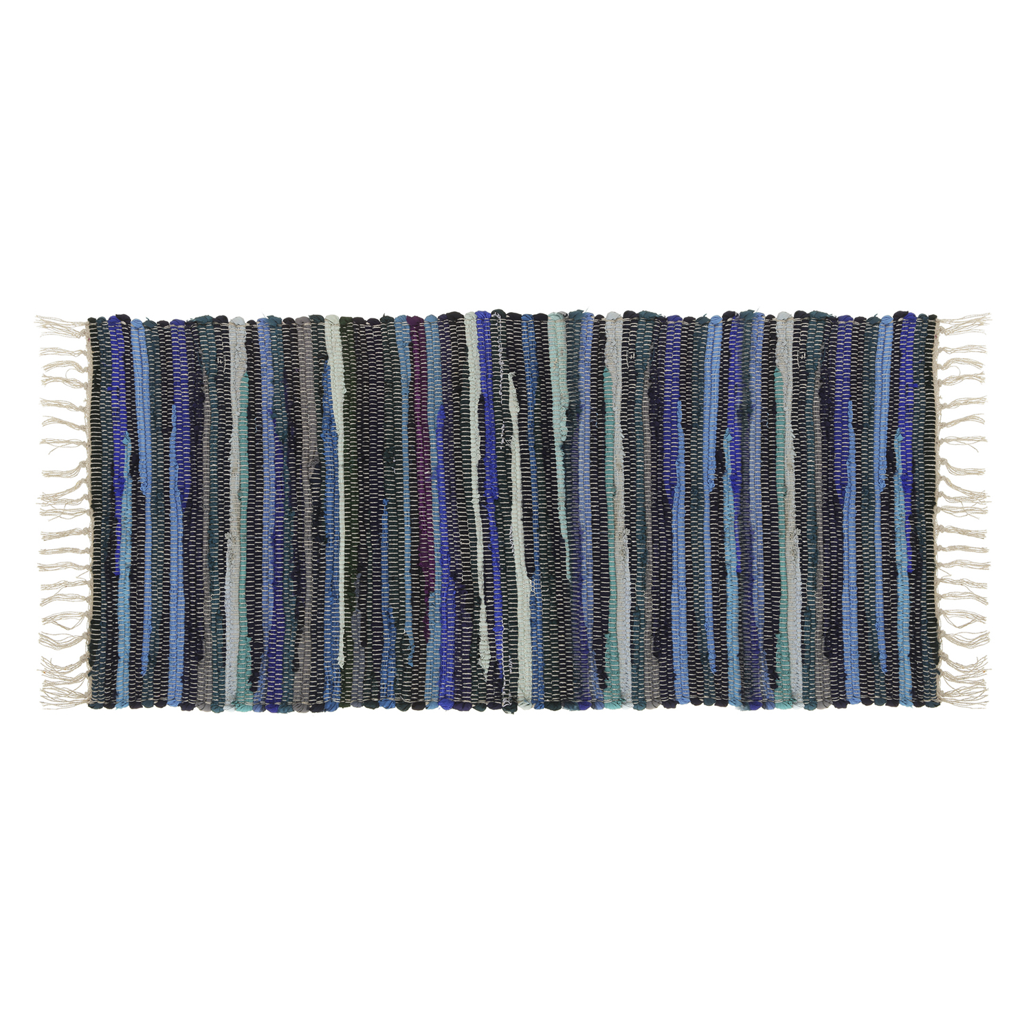 Varie tonalità di blu si legano e si alternano ad altri colori in un armonioso e studiato disordine. Questo tappeto dalla fantasia originale è l'ideale per rendere la tua cucina più vivace. Alle estremità presenta delle soffici frange bianche. Dimensioni: 60x130 cm. L'articolo è un pezzo unico, prodotto di una lavorazione con telaio a mano e composto da materiale tessile riciclato, assemblato artigianalmente. Potrebbe quindi variare per composizione e colorazione rispetto a quello presentato nell'immagine.